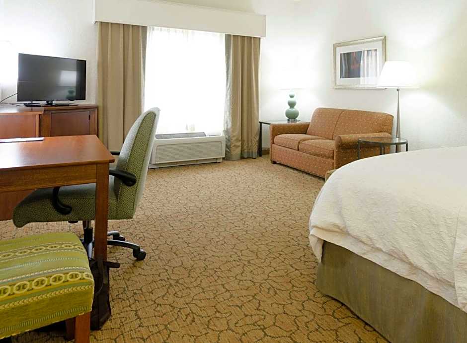 HDTV, free WiFi, sofa bed, large work desk, refrigerator, microwave, coffeemaker Settle into this spacious non-smoking room which provides one king-sized clean and fresh Hampton bed® and a pull-out sofa bed for extra guests. Relax and watch a movie on the HDTV or work at the desk and stay connected with free WiFi access. Enjoy the convenience of having a kitchenette which includes a refrigerator, microwave and a coffeemaker. The bathroom provides fluffy towels, a shower with WaterPik showerhead and a curved shower rod for extra space and light in the shower.